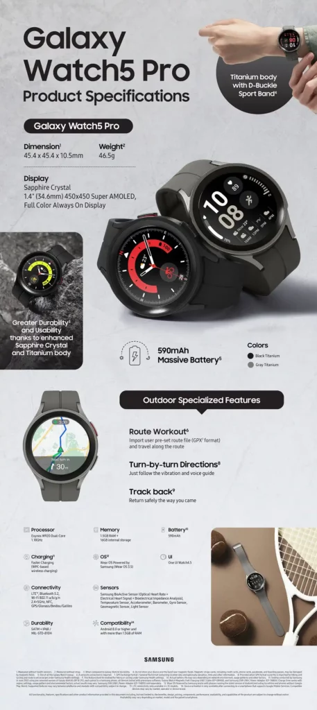 The Galaxy Watch5 Pro is the most rugged in the batch, because it’s built using a reinforced sapphire crystal for the display and a titanium case. Plus, use a next-generation D-Buckle Sport Band. Only on the Pro you can use the GPX service, especially useful for excursions in nature: it supports route tracking, Turn-by-turn navigation so you don’t get lost and the Track back feature to get home safely.