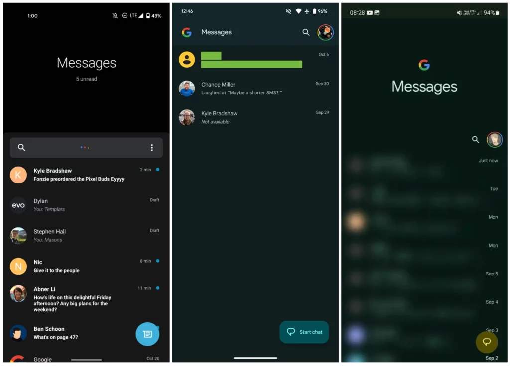 The four-color “G” logo has joined the enormous heading Messages, which is still present, to create extremely noticeable Google branding, which is probably the goal of the overall homescreen redesign. To replace the search field, a magnifying glass symbol has been added to the corner next to your Google Account avatar. To access Archived, Spam, and Banned, tap it to bring up a menu. Mark all as read, device pairing, your message data, message settings, and help and feedback.