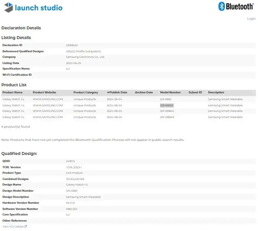 The listing of the smartwatch mentions the wearable’s name, the Galaxy Watch FE, which has been spotted on the Bluetooth SIG platform. Reportedly, the Galaxy Watch FE has Bluetooth 5.3, similar to the Galaxy Watch 7, and it will arrive in four variants with specific model numbers: