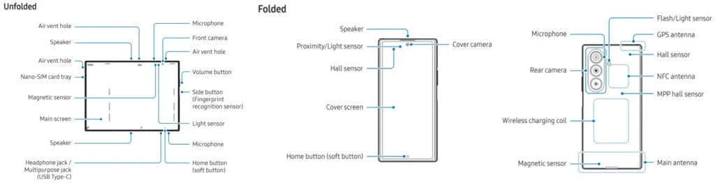 The user manual includes key specifications, unique features, design details, and much more. Notably, it shows exactly where everything is located on the device via a labeled diagram, which locates the position of the air vent hole, microphones, speakers, magnetic sensor, nano SIM card tray, additional sensors, and the headphone jack.