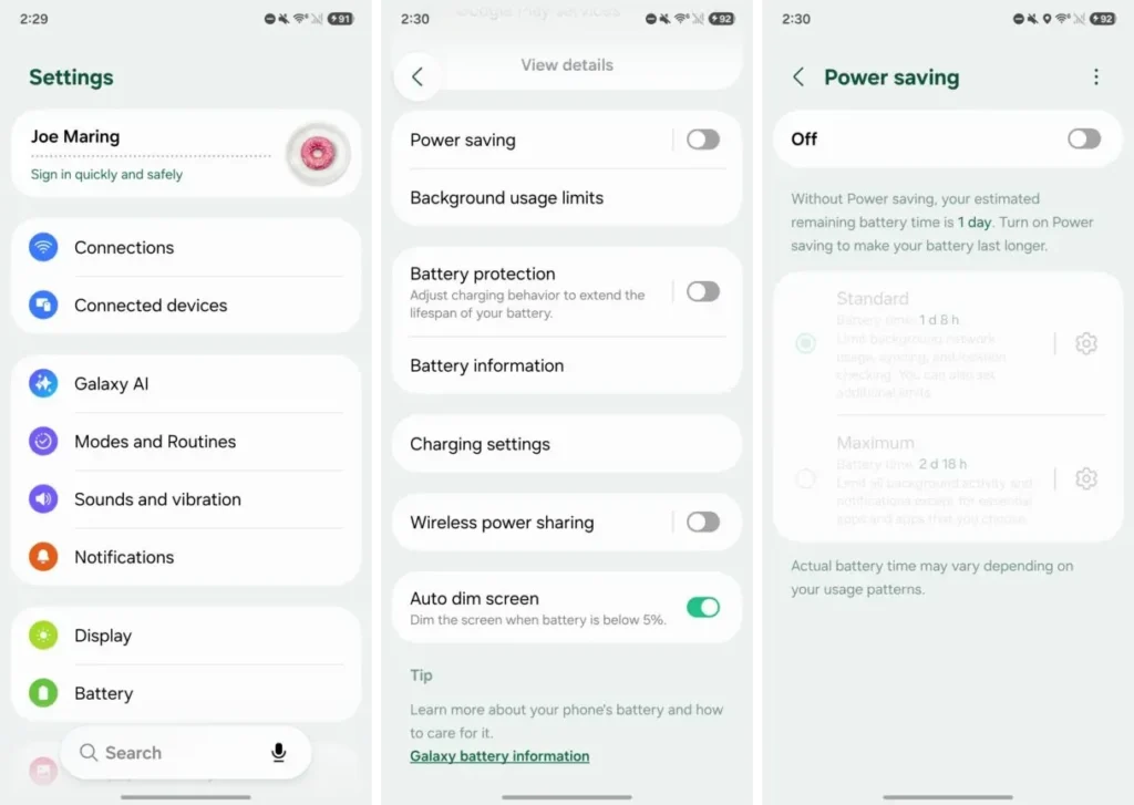 However, these are the usual changes that Power Saving has made in previous One UI versions. Notably, while tapping on the gear icon next to Standard allows users to disable any of the settings user don’t want, Power Saving changes.
